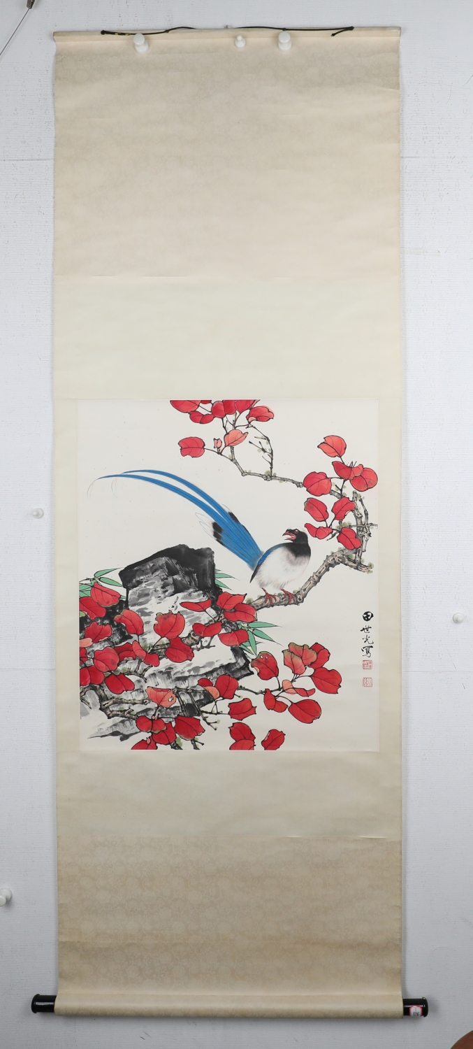 田世光(1916年10月—1999年7月)号公炜,祖籍山东乐陵,世居北京西海淀六郎庄。师承张大千、赵梦朱、吴镜汀、于非闇、齐白石诸先生。早年拜张大千门下,为大风堂弟子之一 。早年求学于京华美术学院,专攻国画花鸟,解放前在北平国立艺专任教,曾任中央美院教授。他长期从事花鸟、山水画创作,继承了宋元派双勾重彩工笔花鸟画的优良传统技法,并赋之予新的时代精神,为我国现代工笔花鸟画名家。田世光先生是中国美术家协会会员,北京工笔重彩画副会长,中国画研究院第一届院务委员。