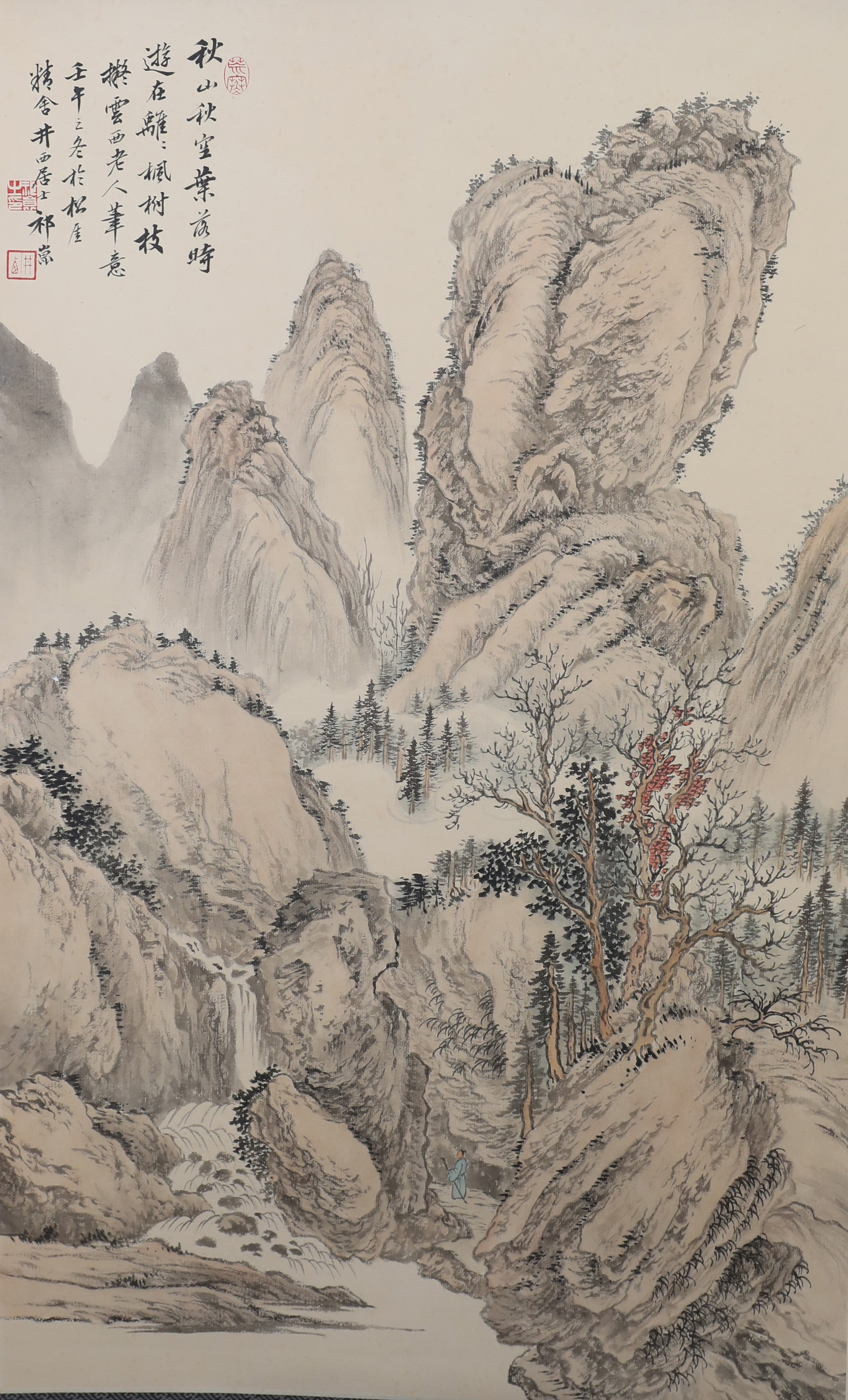 祁井西(又名祁昆1901—1944)字景西,号井西居士,斋号曰松崖精舍。北京人。初以籹卖颜色得识京城名家,刻励自学。因受民初追踪宋元之风的影响,专意摹古临古,尚北宗山水,所画理法精严,笔墨精致,枯润合度。在20-40年代的北京有一定影响。工细山水得明人遗意,又精篆刻。性喜犬,室内床上下所蓄犬无思十余头,可谓奇癖,所作山水,规模明人,而近于王翚。作风精细清润,构图全出之正统派民国初年北京画坛以王翚为“神圣不可侵犯”,祁氏亦受影响,在学王诸诸家中堪称翘楚。但用笔略嫌拘谨板实,工稳有余,创意不足。弟子有郭传璋、徐鼎正、梁树年等。